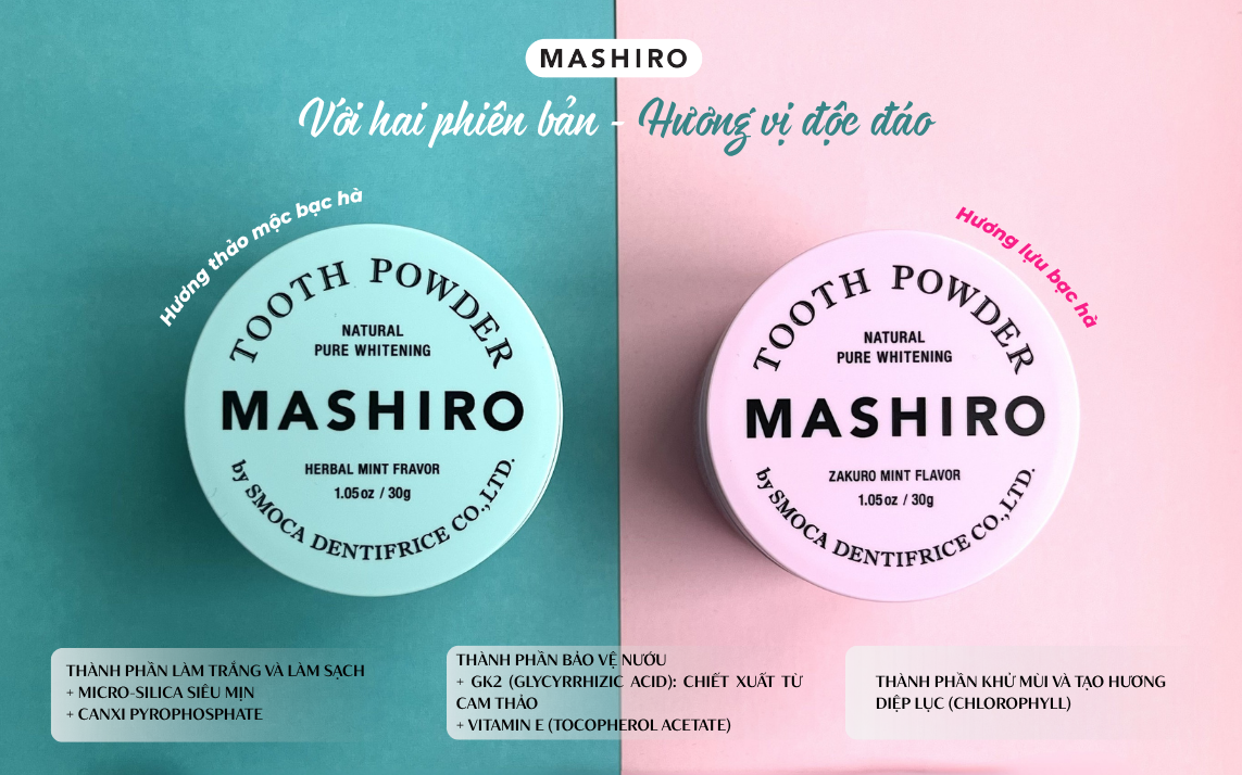 Với công thức kết hợp các thành phần như hạt Silica siêu mịn và Canxi Pyrophosphate, Mashiro hỗ trợ làm sạch bề mặt răng, góp phần loại bỏ mảng bám mà vẫn hạn chế tác động đến men răng. Bên cạnh đó, hoạt chất Dipotassium Glycyrrhizate (GK2) có nguồn gốc từ cam thảo giúp hỗ trợ làm dịu nướu, trong khi Vitamin E góp phần duy trì trạng thái khỏe mạnh của khoang miệng. Sự bổ sung của bột diệp lục mang lại cảm giác tươi mát, hỗ trợ cải thiện hơi thở sau khi sử dụng. Nhờ sự kết hợp này, sản phẩm không chỉ hướng đến hiệu quả làm sạch và cải thiện màu răng mà còn góp phần chăm sóc răng miệng theo hướng ổn định và lâu dài.